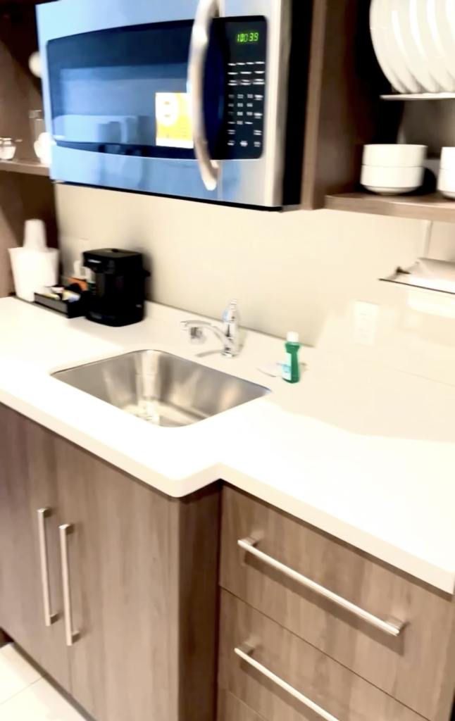 This kitchenette has brand-new everything you could ask for or imagine. It also boasts a full-sized fridge, which is nice for lunching in the room or preparing sandwiches and snacks for the parks (read more here about food we bring to Disneyland).