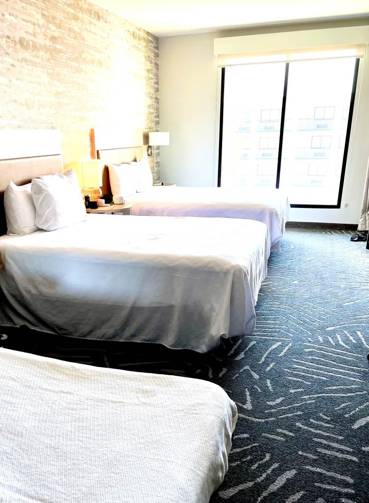 My husband actually asked me why the beds in this hotel are softer than ours, and I don’t have a great answer; needless to say, we slept well here. Even though this property is next to a freeway, they strategically positioned the rooms on the Disneyland side, so they’re nice and quiet (request an even-numbered room on the sixth floor for views of the parks and nightly Disneyland fireworks shows).