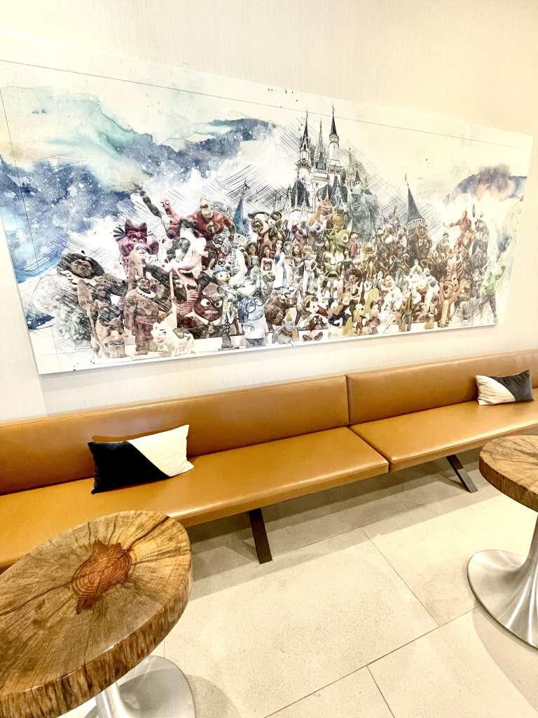 There were several sitting areas in this bright hotel lobby, along with restrooms and a drinking fountain/water bottle filling station (we filled our water bottles every morning before heading to the parks!). The restaurant and bar were so new they weren’t even open for use!