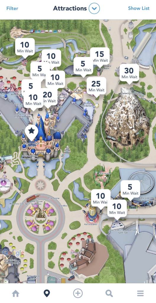 To begin with, you can always check wait times for attraction lines with ease in the Disneyland app (I’ve checked them from the couch at home–that’s not weird at all). Simply pull up the app and click on the upside-down tear drop at the bottom of the main screen: