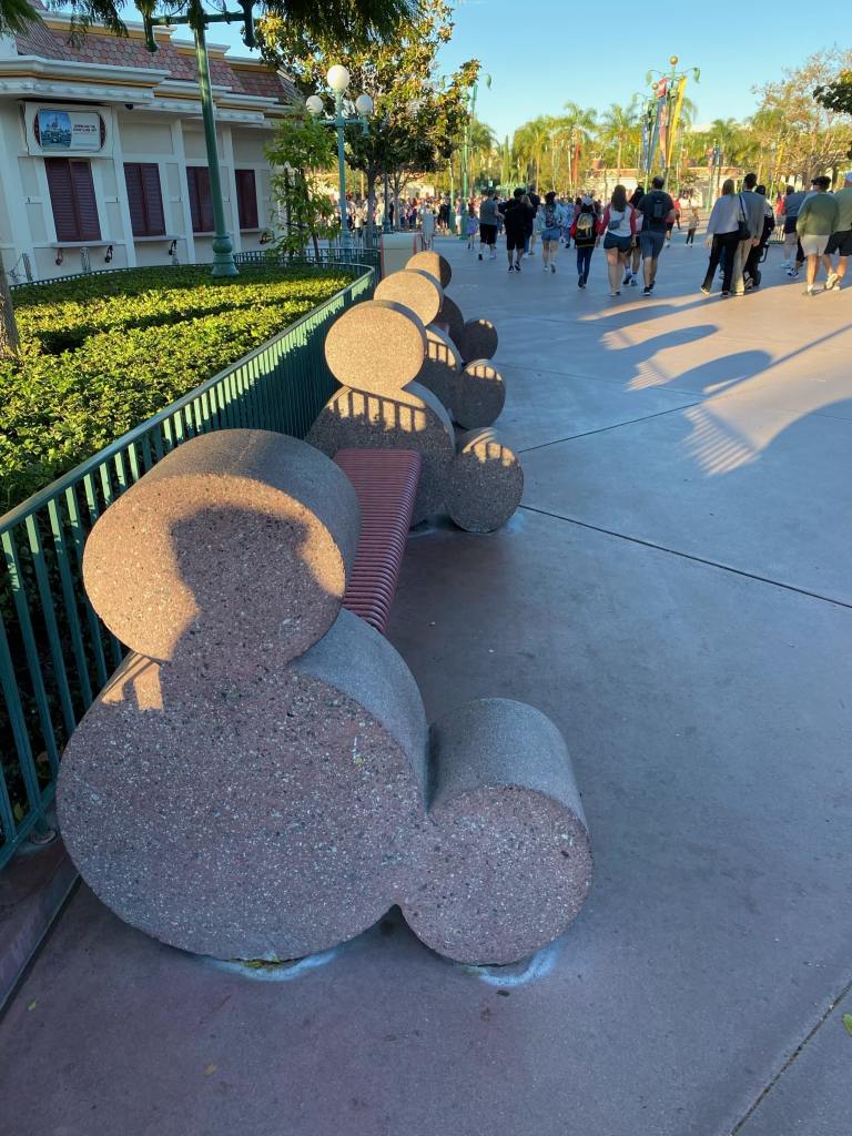 There are benches all over the parks where you can sit and watch people and characters pass by. In Disneyland, if you sit on one of the benches in the Town Square near the castle long enough, you are sure to catch a parade, a cavalcade, characters walking by or just enjoy watching people.