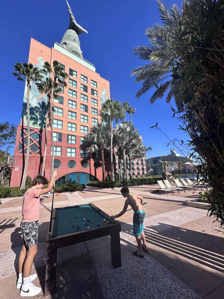 We absolutely love the grounds of the Dolphin resort. On our park rest days, we enjoyed swimming in the pools (pools at the Dolphin are open 9am-9pm), going down the slides and relaxing in the hot tubs. My daughter and I spent time on the beach. We spent hours playing ping pong and pool as a family near the basketball court.